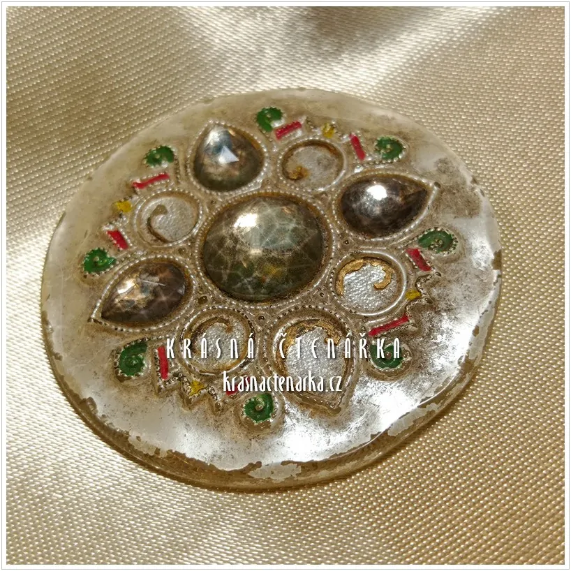 Stav: Zachovalý, poškozeno (odlepené skleněné kameny)
