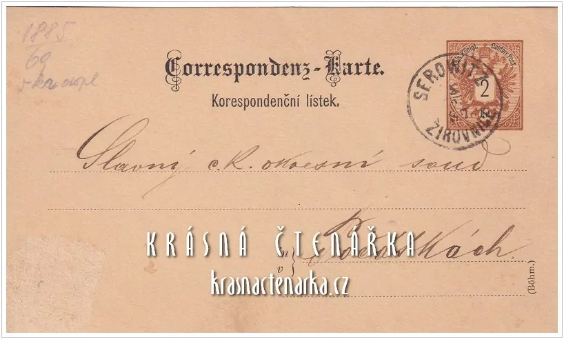 KORESPONDENČNÍ LÍSTEK, Zpráva okresnímu soudu v Počátkách z roku 1887, razítko ŽIROVNICESkladem200 Kč/ ks