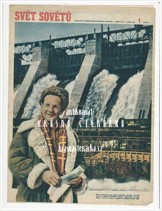 - NOVÁ HRDINSKÁ PRÁCE ČEKÁ SOVĚTSKÉHO ČLOVĚKA v novém roce na velkých vodních elektrárnách (Obálka časopisu SVĚT SOVĚTŮ 1955)