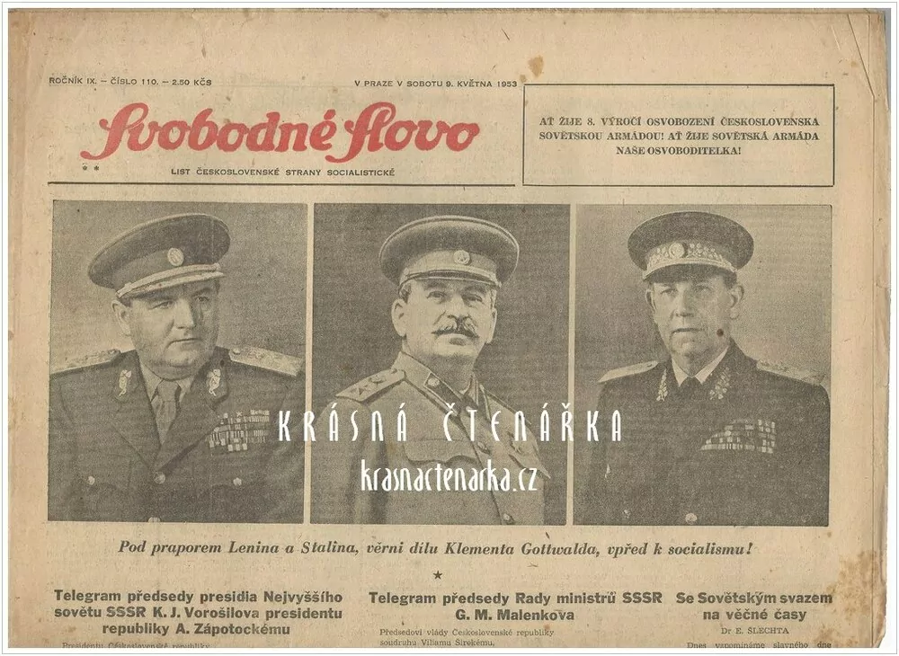 - SVOBODNÉ SLOVO, číslo 110 z 9.5. 1953, Ať žije 8. výročí osvobození Československa sovětskou armádou !