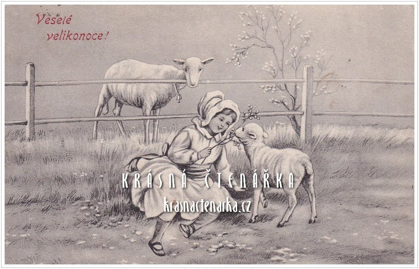 VELIKONOČNÍ pohlednice a dívenka s ovcemi