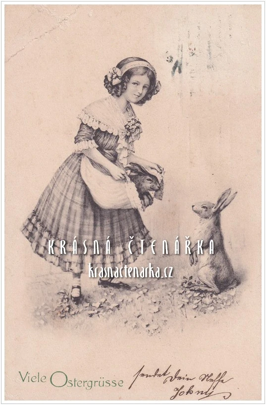 VELIKONOČNÍ pohlednice a dívka se zajíčky
